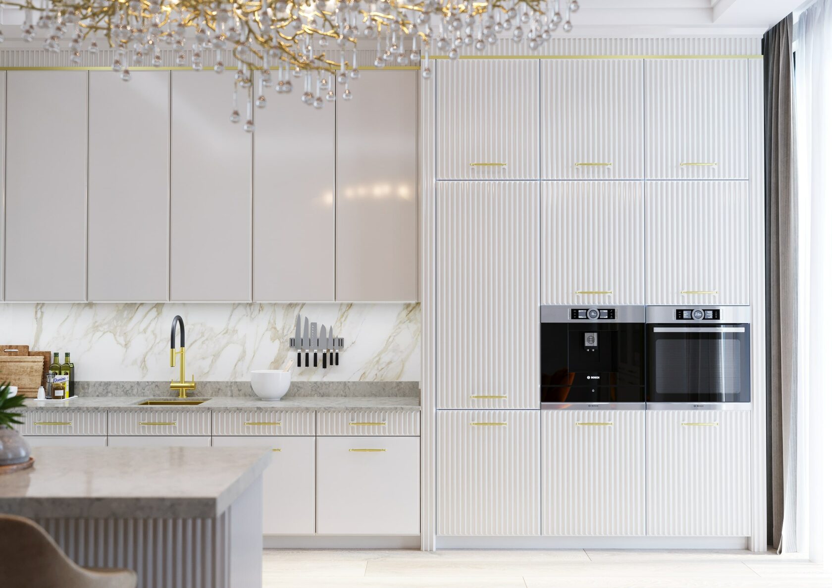 Кухня «Афина» станет центральным акцентом Вашего интерьера. Такая кухня понравится тем, кто не любит банальность. Фасады кухни выполнены из МДФ покрыт 8-мью слоями эмали и лака, с неповторимой фрезеровкой, что придает фасаду кухни глубокий 3D эффект, и прекрасно сочетается с современным интерьером. Внутреннее содержание включает уникальные системы хранения для запасов и специй, моющих средств и досок, винных коллекций, столовых приборов. Приготовление еды на этой кухне станет настоящим удовольствием и сделает повседневную жизнь комфортной. Ее дизайн - восхищение и ничего лишнего, только удовольствие и радость на завтрак, обед и ужин!