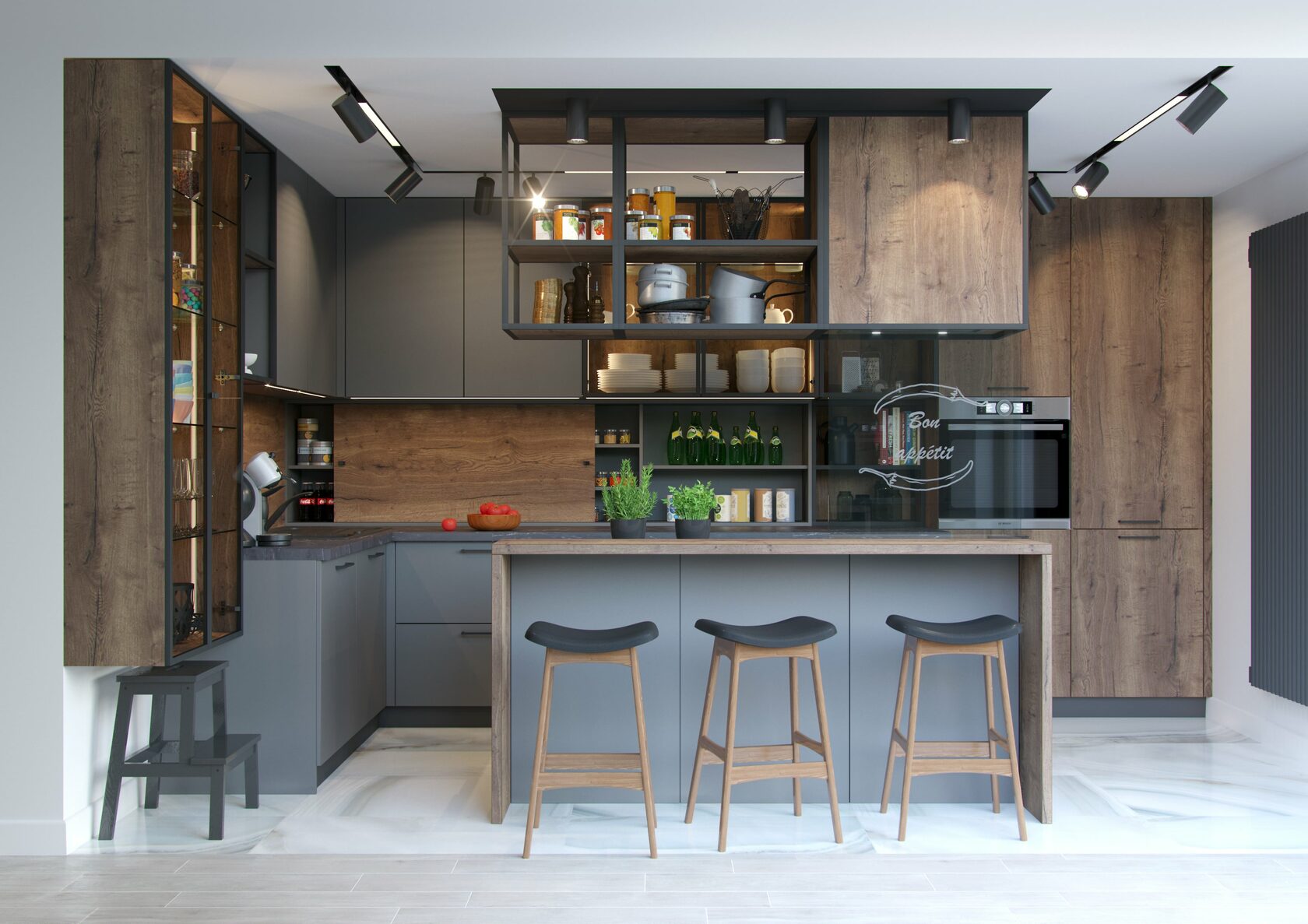 Эргономичность планировки — залог удобства и практичности данной модели. Кухня имеет много пространства для организации хранения, позволяющего разместить продукты, домашнюю утварь и посуду. Остров, с незаметно расположенной варочной панелью, служит дополнительным пространством для приготовления пищи, здесь же отведено место под барную зону. Композицию дополняют лаконично встроенные в фартуке кухни розетки и невидимая подсветка.